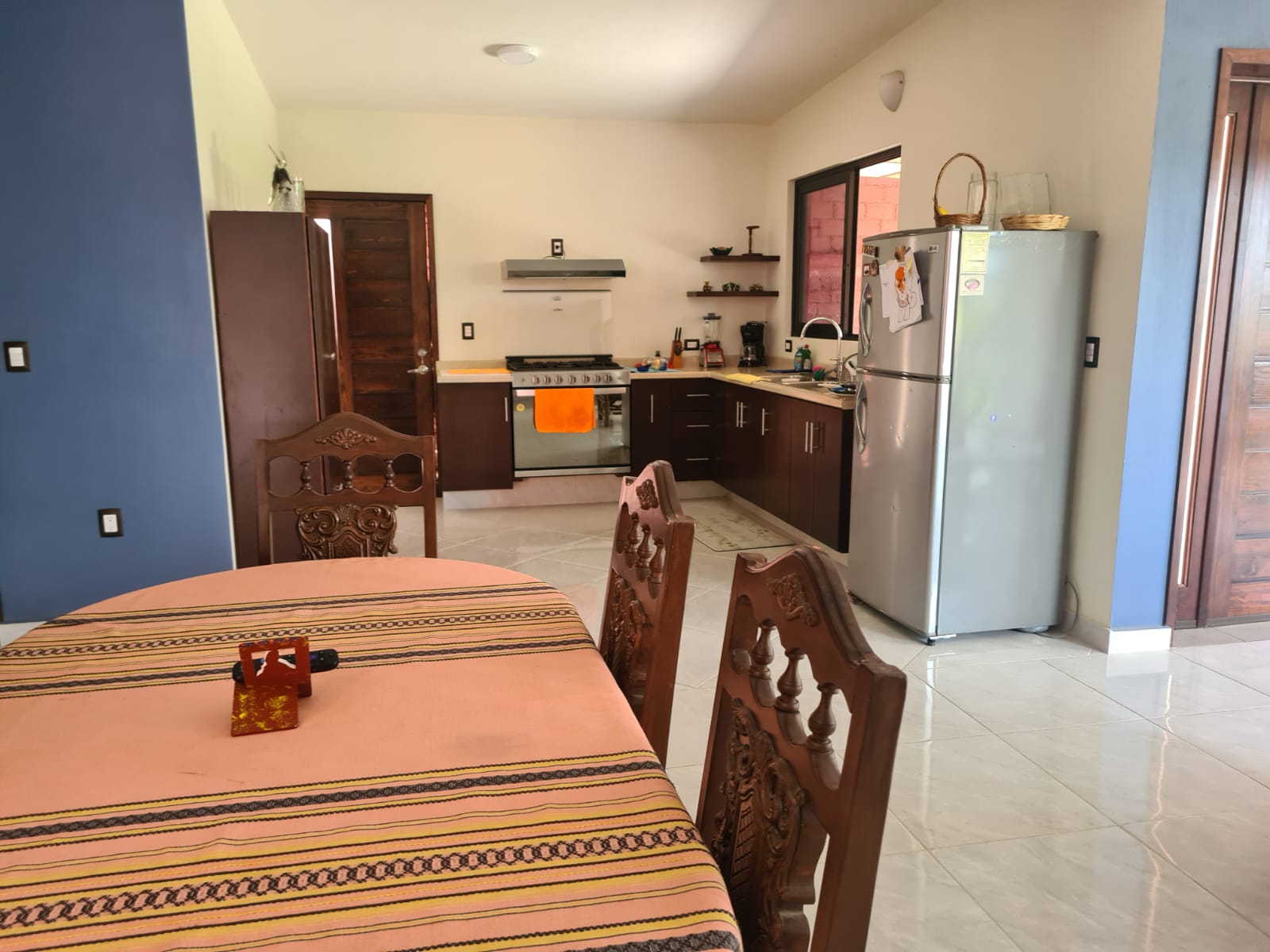 • Open-Concept Living: A bright dining and kitchen area featuring beautiful hand-carved wooden furniture and contemporary cabinetry.